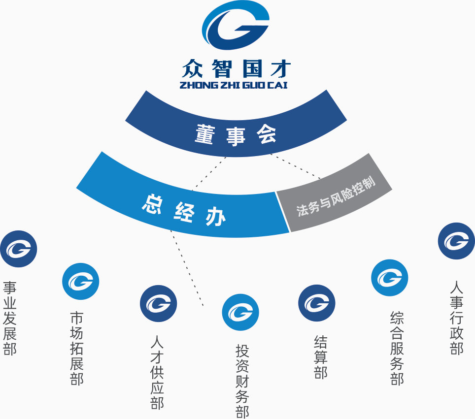 公司设有董事会、总经办、事业发展部、法务与风险控制、市场拓展部、人才供应部、结算部、投资财务部、综合服务部、人事行政部10大部门。公司具备先进的经营理念、专业的服务团队、良好的服务意识、规范的工作流程、高效的信息化管理,能够为广大客户单位提供优质的人力资源专业服务